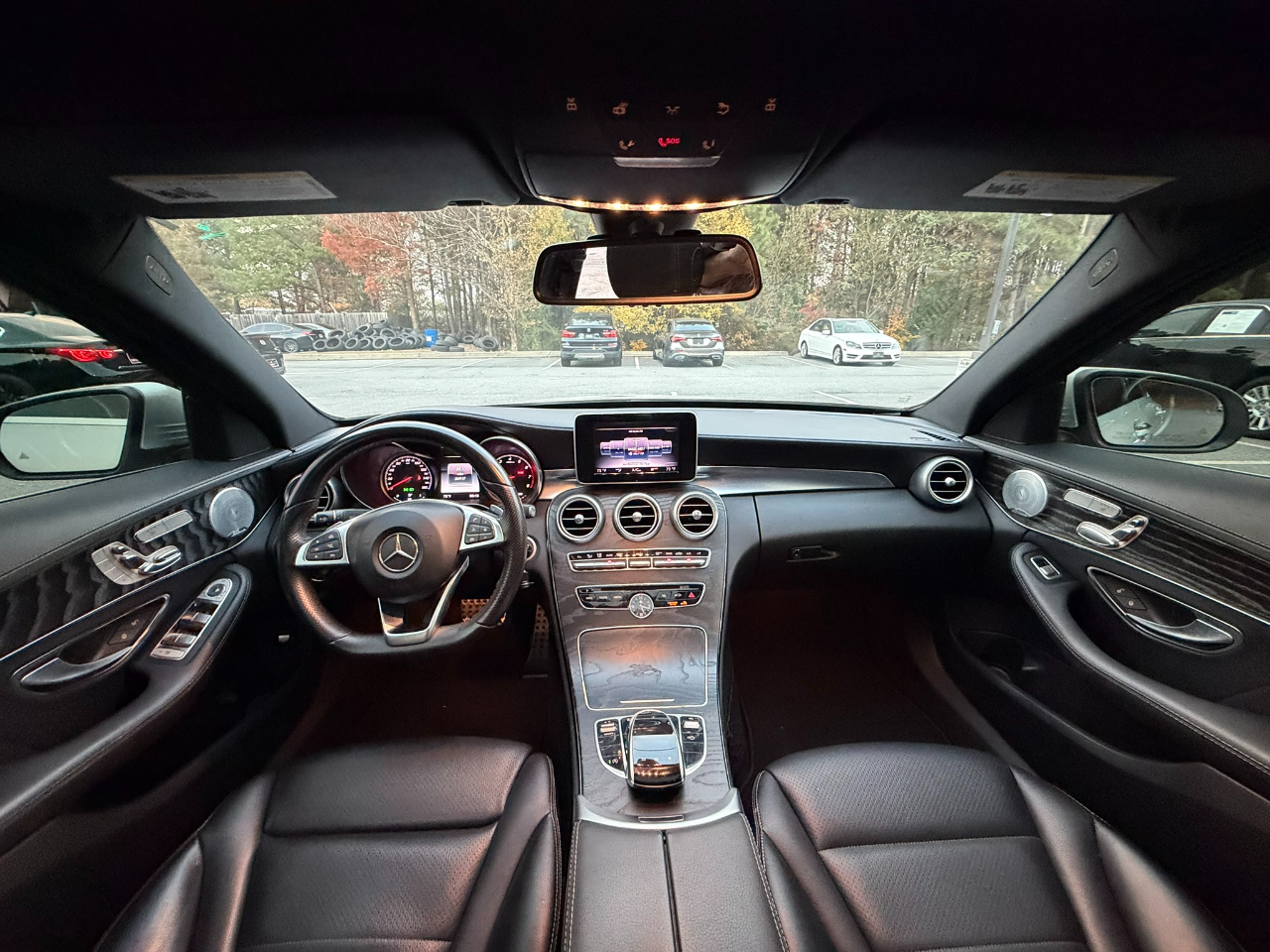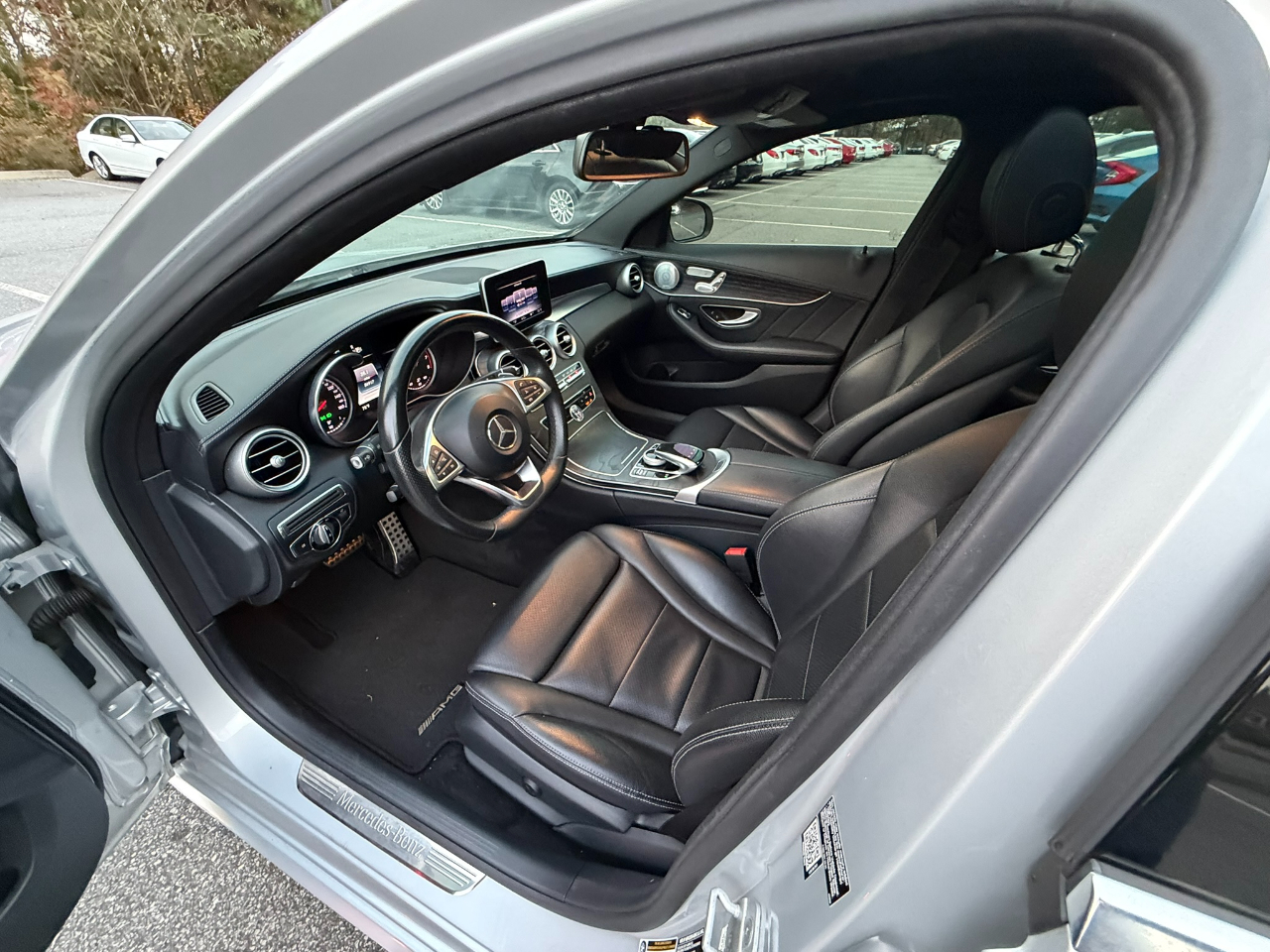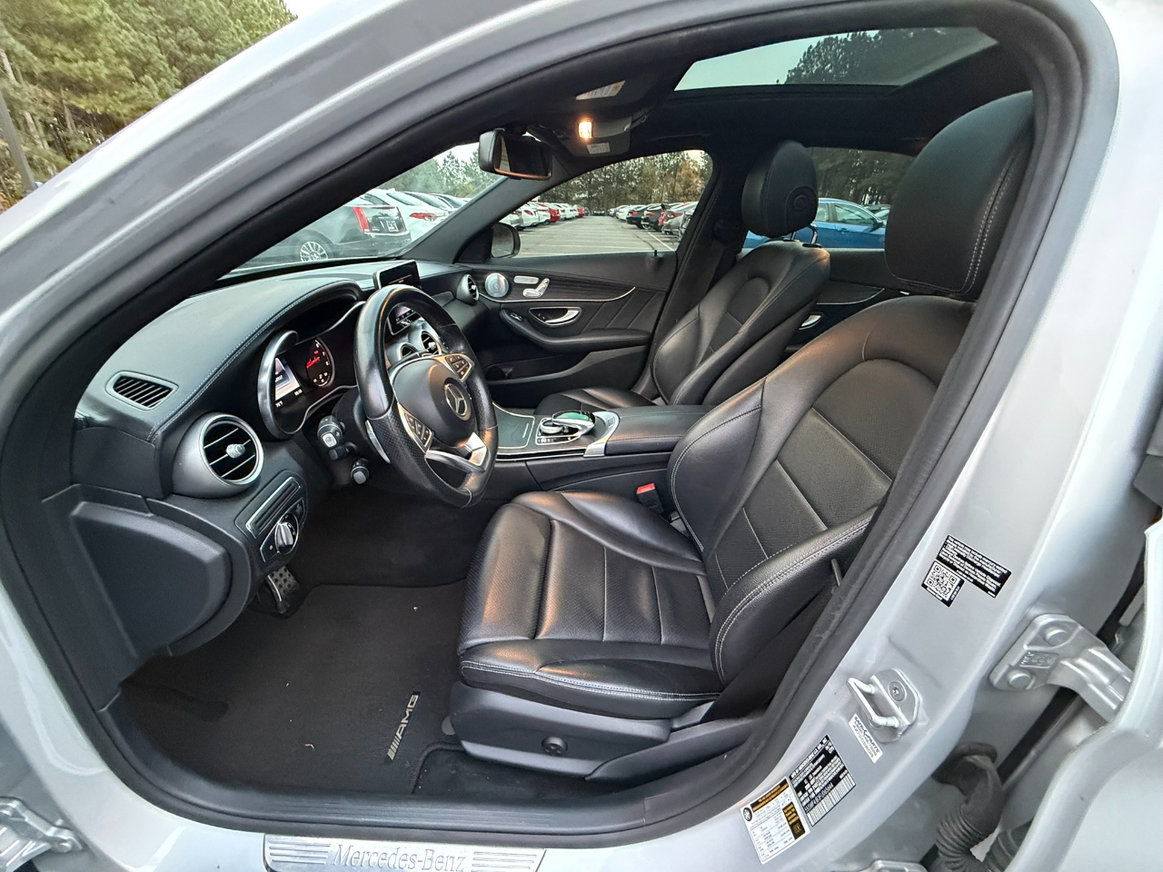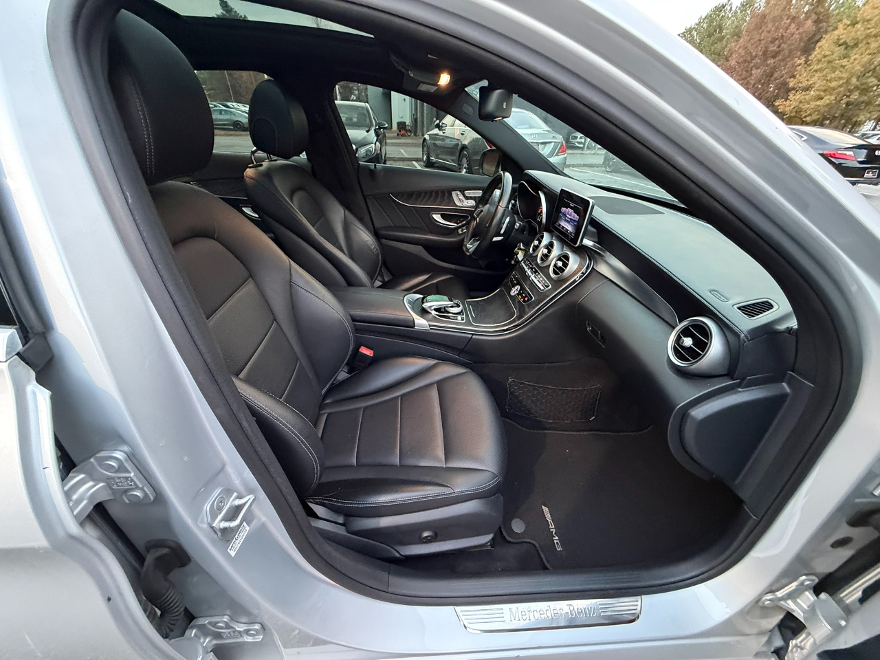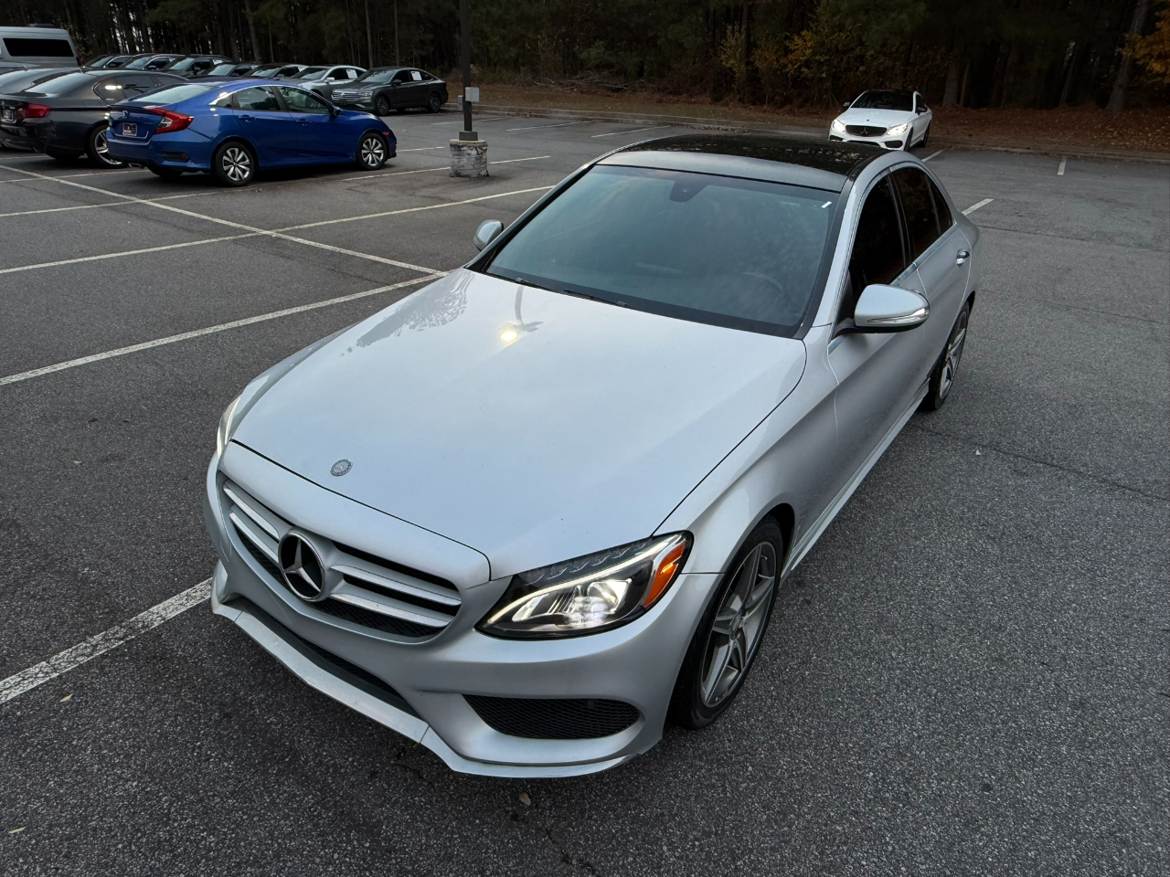 2015 Mercedes-Benz C300 finished in iridium silver metallic and equipped with the sought-after sport package featuring AMG bodystyling, sport suspension, 18"/19" AMG wheels with high-performance tires, open pore black ash trim, black headliner, sport seats, flat-bottom steering wheel, perforated front brake discs, aluminum pedals, and AMG floormats with MB-Tex dash stitching. Enjoy premium upgrades, including the panorama sunroof, Burmester premium sound, SiriusXM, keyless go, LED headlamps and taillights, heated front seats, blind spot assist, rearview camera, rear deck spoiler, analog dash clock, and wheel locks. sleek, sporty, and fully loaded
