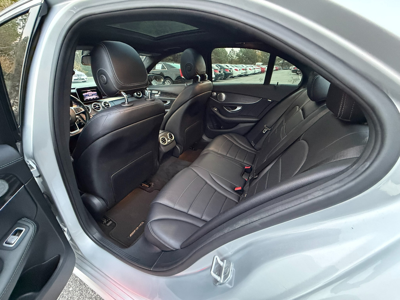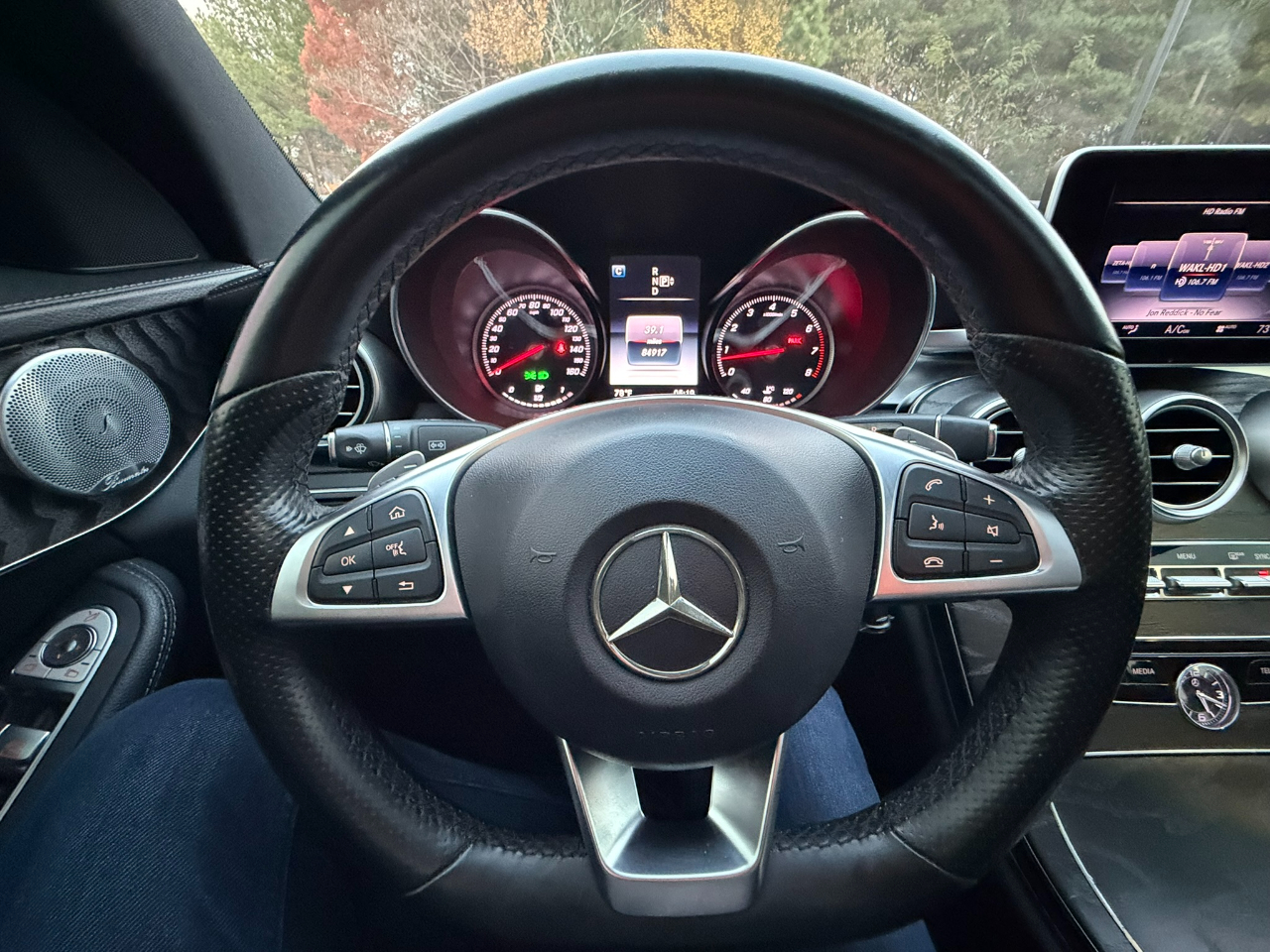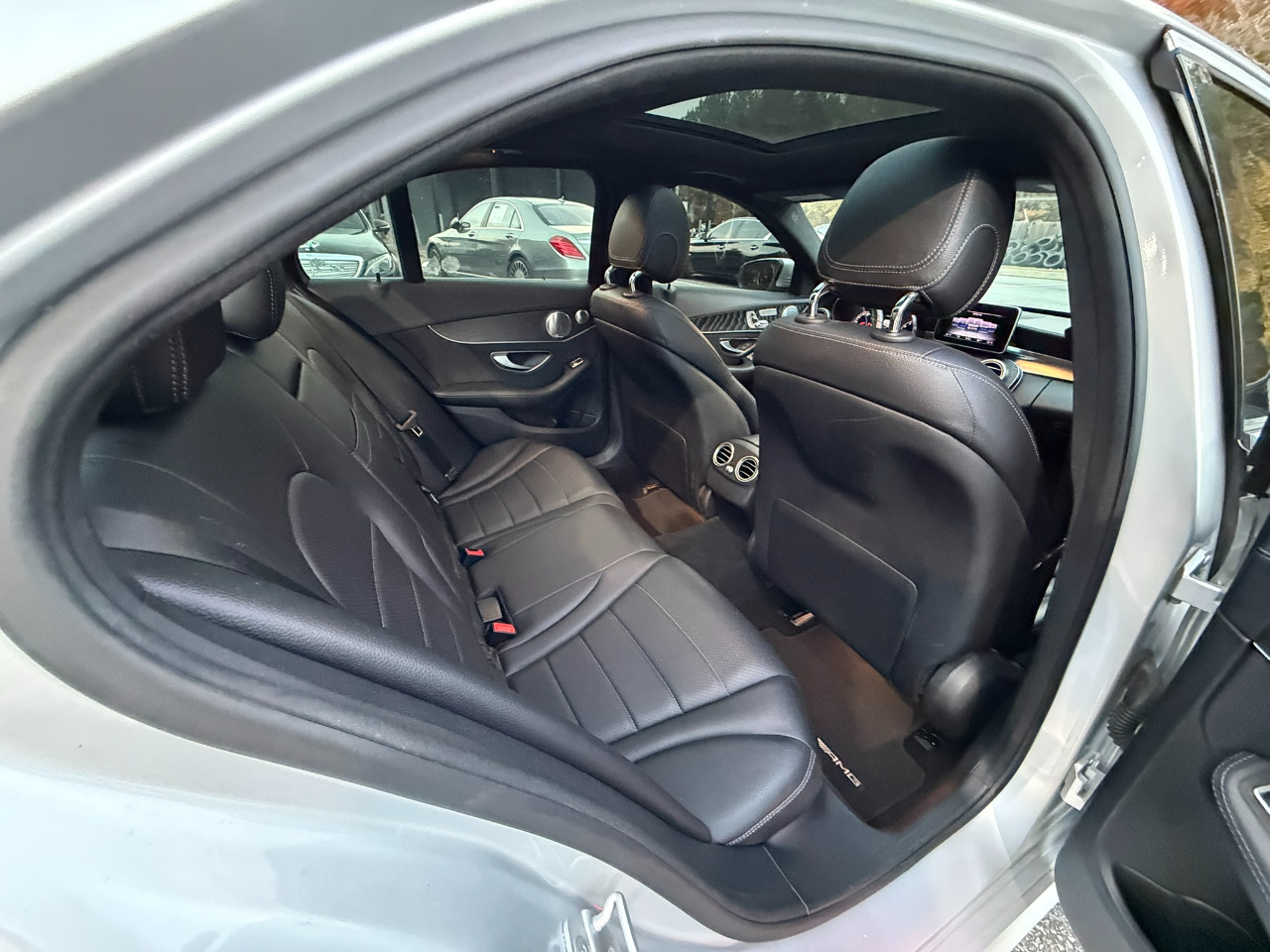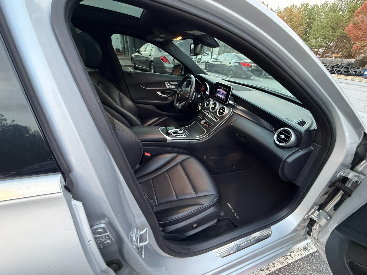2015 Mercedes-Benz C300 finished in iridium silver metallic and equipped with the sought-after sport package featuring AMG bodystyling, sport suspension, 18"/19" AMG wheels with high-performance tires, open pore black ash trim, black headliner, sport seats, flat-bottom steering wheel, perforated front brake discs, aluminum pedals, and AMG floormats with MB-Tex dash stitching. Enjoy premium upgrades, including the panorama sunroof, Burmester premium sound, SiriusXM, keyless go, LED headlamps and taillights, heated front seats, blind spot assist, rearview camera, rear deck spoiler, analog dash clock, and wheel locks. sleek, sporty, and fully loaded