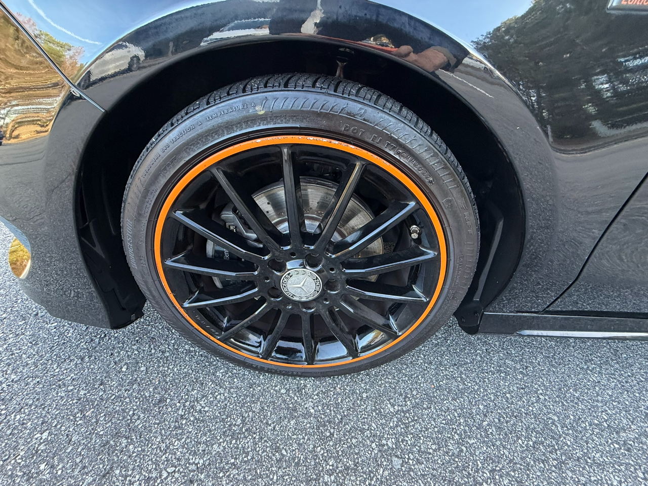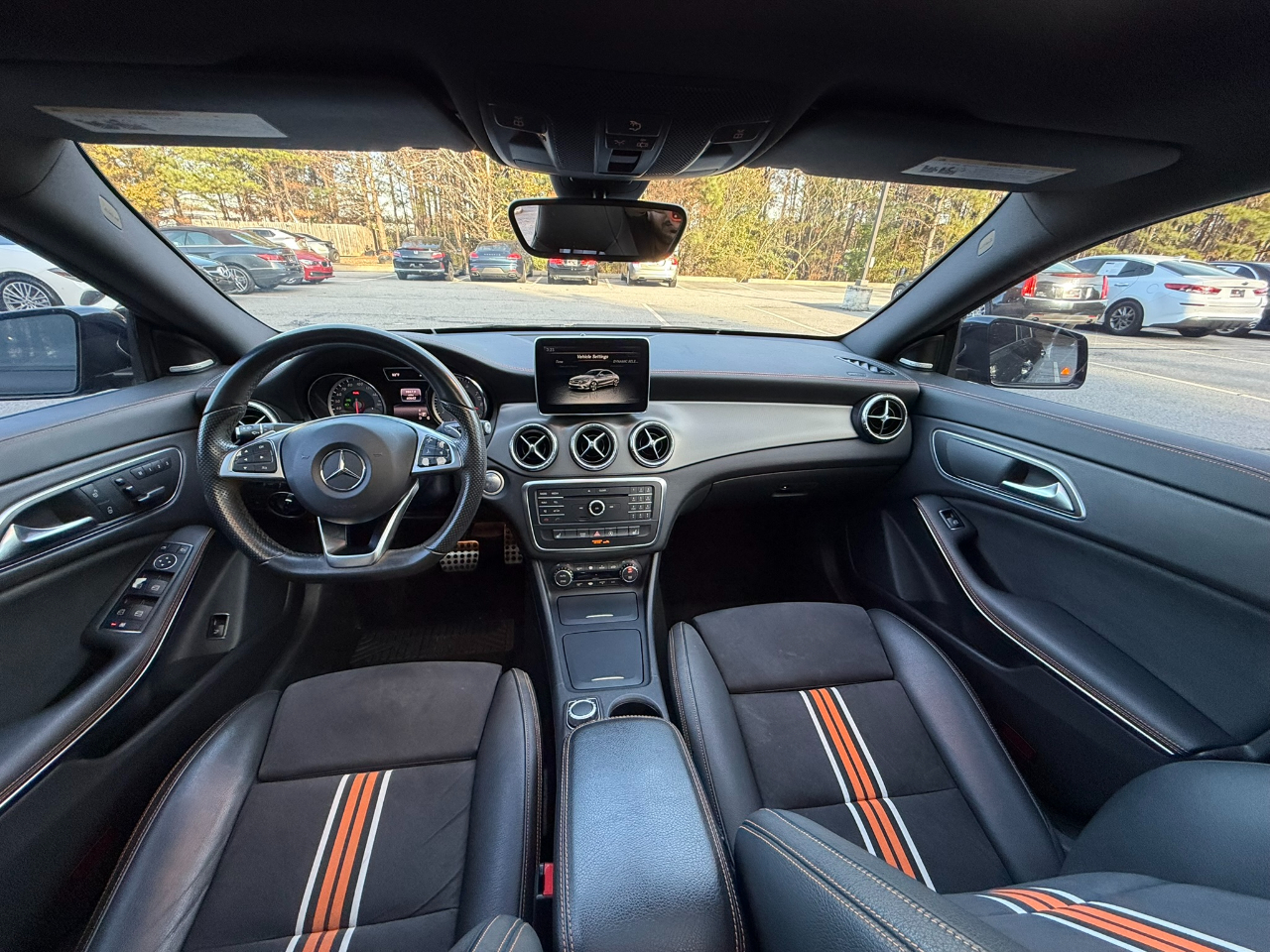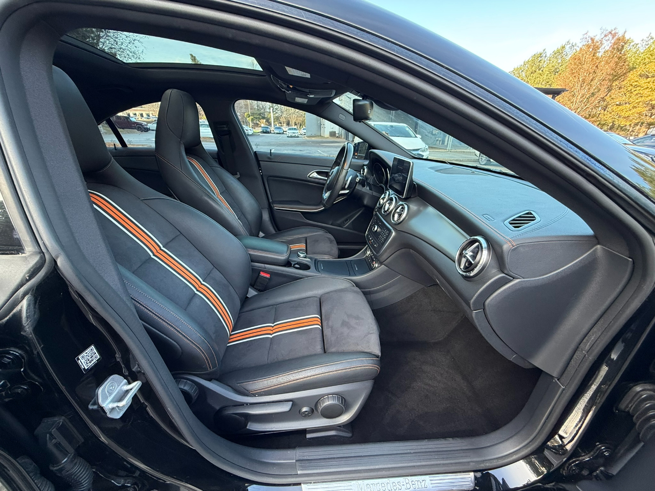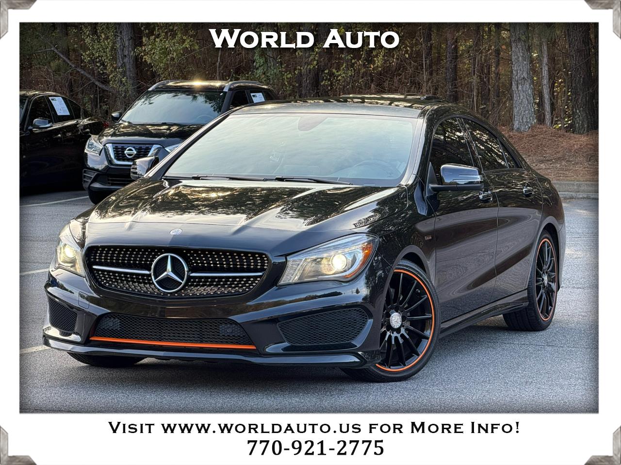 2016 Mercedes-Benz CLA250 in Cosmos Black Metallic on Black/orange, Edition Orange Package, featuring a Super Sport Steering Wheel, exterior badge, and 8" color display. Equipped with the Premium 1 Package including Garage Door Opener, Compass, Heated Front Seats, Auto-Dimming Mirrors, Harman/Kardon Sound System, SiriusXM Satellite Radio, and KEYLESS GO. Sport Package adds perforated front disc brakes with MB logo, AMG Body Styling, Sport Appearance Package, and Diamond Grille with Silver Pins. Additional features include Blind Spot Assist, Aluminum Trim with Dark Honeycomb Grain, Night Package with black window trim and black exterior accents, 18" AMG Multi-Spoke Black Finish Wheels with all-season tires, Panorama Sunroof, Ambient Lighting with 12 colors, Rearview Camera, and Bi-Xenon Headlamps with LED Taillights, plus Audio 20 CD with Garmin navigation pre-wiring. A sharp, stylish CLA with standout appearance and premium equipment — contact World Auto at 770-921-2775 for more details.