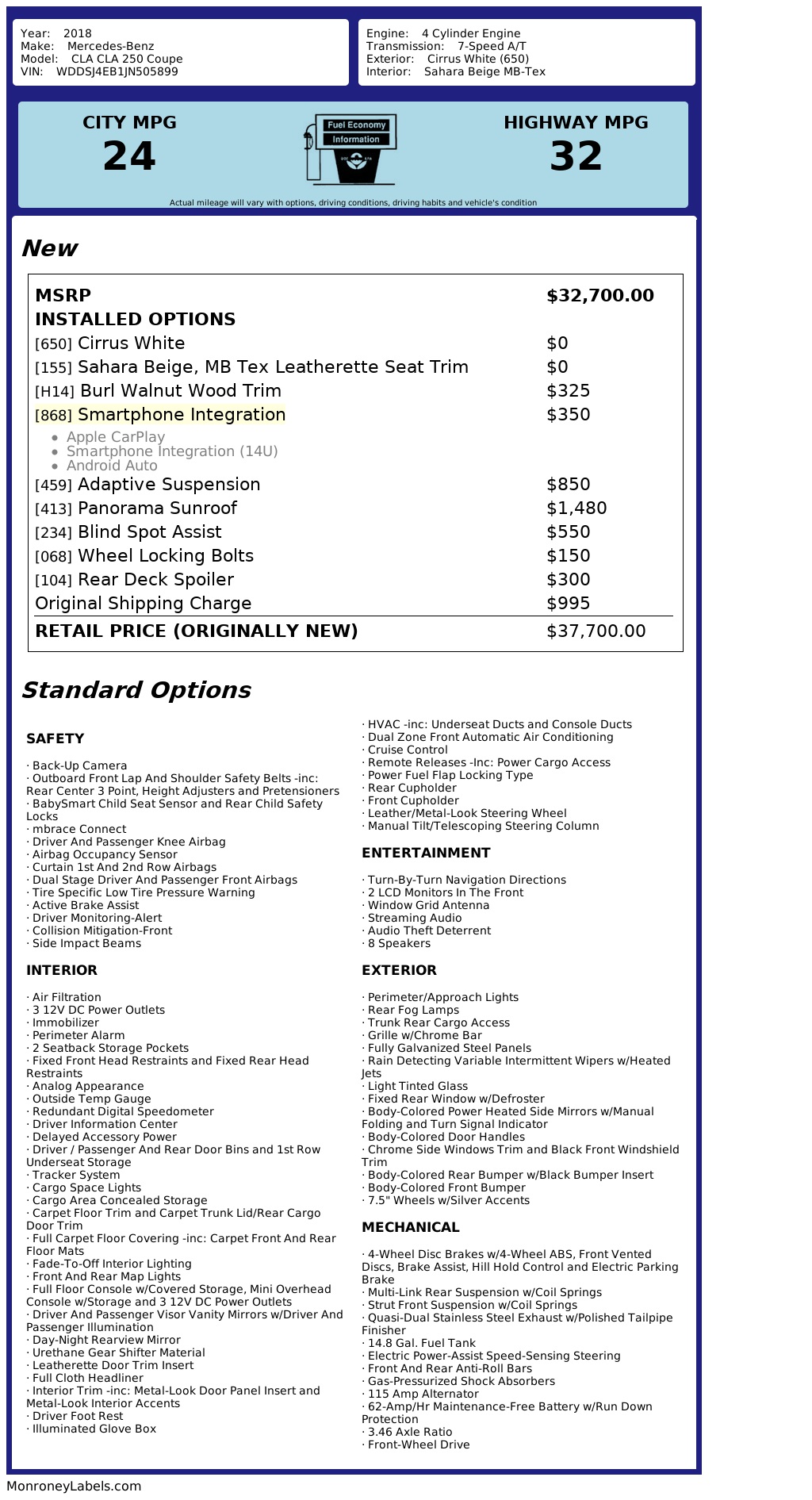 2018 Mercedes-Benz CLA250 Coupe, Cirrus White on Sahara Beige MB-Tex, Automatic Transmission, Panorama Sunroof, Smartphone Integration Package w/Apple CarPlay & Android Auto, Adaptive Suspension, Blind Spot Assist, Burl Walnut Wood Trim, Rear Deck Spoiler, Backup Camera, Bluetooth, Dual Zone Climate Control, Premium Sound System, Power Seats, Cruise Control, LED Lighting, Alloy Wheels, And Much More. A Sporty And Fuel-Efficient Luxury Coupe Offering Sleek Styling, Advanced Technology, And A Smooth Comfortable Ride. Please Contact World Auto For More Information at 770-921-2775.