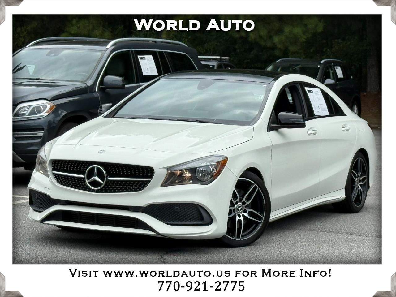 2018 MERCEDES BENZ CLA250, WHITE ON BLACK, AUTOMATIC TRANSMISSON, AMG LINE, PREMIUM PACKAGE, APPLE CARPLAY, ANDROID AUTO, BACKUP CAMERA, BLUETOOTH, PUSH BUTTON START, KEYLESS-GO, AMG WHEEL, LEATHER, CD, ALLOYS, DUAL POWER SEATS, HEATED SEATS, BLIND SPOT ASSIST, POWER WINDOWS, POWER DOOR LOCKS, CRUISE, TILT, ABS, COLD AC, HEAT, LOADED, GOOD LOW MILES, PLEASE CONTACT WORLD AUTO FOR MORE INFORMATION AT 770-921-2775. Take a thrilling ride in this dazzling Cirrus White 2018 Mercedes-Benz CLA-Class used car! Unleash your inner child with the safety door locks keeping your little ones secure on your adventures. The anti-theft system will give you peace of mind as you cruise around town. Feel the power of the ABS brakes as you make quick stops with confidence. The driver airbag, front side airbag, passenger airbag, and side head curtain airbags are like having a personal bodyguard by your side. Adjust the telescopic steering column to your perfect driving position before settling into the plush driver's seat with multiple power adjustments. Let the front power lumbar support melt away any stress as you feel the luxurious comfort of the passenger multi-adjustable power seat. Engage the power windows with just a touch as you glide smoothly through the streets. This Mercedes-Benz CLA-Class is not just a car - it's a thrilling experience waiting for you to seize.